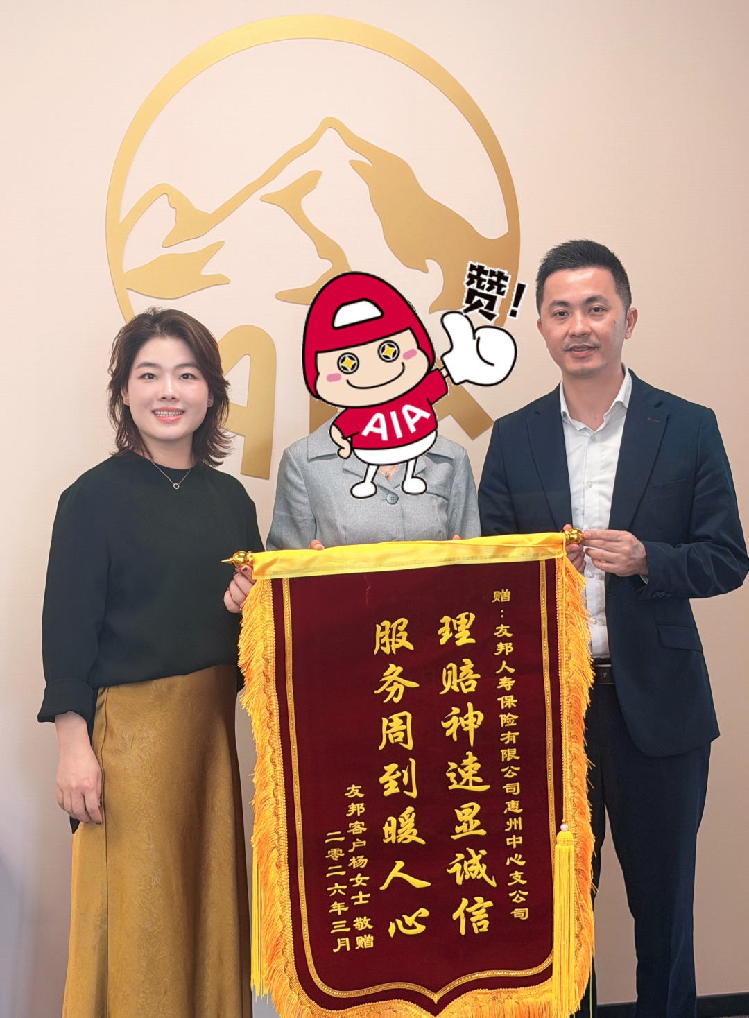 近日,友邦人寿惠州中支迎来暖心一幕:客户杨女士专程送来一面印有“理赔神速显诚信 服务周到暖人心”的锦旗,对友邦人寿三年来在其抗癌治疗中提供坚实保障与全程陪伴表达由衷感谢。客户在赠送锦旗时动情说道:“三年抗癌路,友邦伴我行。感谢友邦人寿提供的保障,还有营销员张海媚女士的贴心服务,让我们在最艰难的时刻依然感受到安心与希望。”